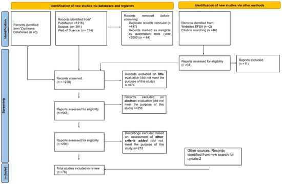 In July 2023 and July 2024, scientific literature was searched in the PubMed, Web of Science (WoS), Scopus, EFSA, and Cochrane databases. Meanwhile, the Cochrane databases yielded no results. The initial research on PubMed, Scopus, and WoS identified 1751 articles. After restricting the dataset to studies published from the year 2000 onwards and removing duplicates, 1220 articles were screened. An additional 37 relevant records were identified in the Journal of the EFSA and its citations. After screening the title and abstract, 674 articles were excluded, leaving 290 studies. Applying exclusion criteria based on species type (non-marine fish) led to the removal of an additional 212 studies. The final dataset comprised 78 studies focused on bioaccumulation (Figure 1).