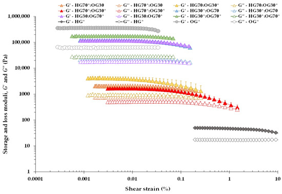 Storage modulus (G′) and loss modulus (G″) at 25 °C for bigels prepared at 70:30 and 30:70 ratios, as well as for the individual hydrogel (HG*) and oleogel (OG*) phases, as a function of the applied shear strain at 1 Hz.