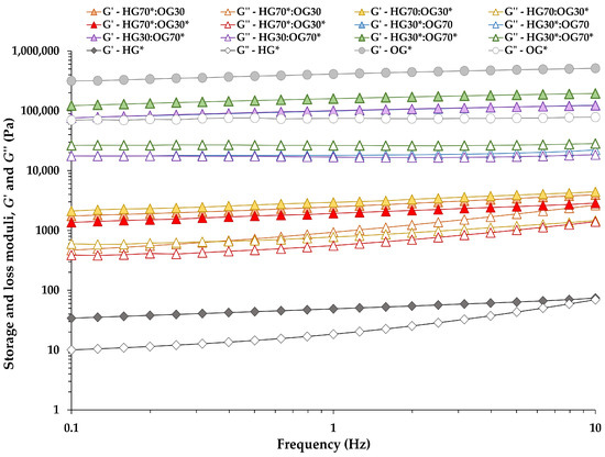 Storage modulus (G′) and loss modulus (G″) at 25 °C for bigels prepared at 70:30 and 30:70 ratios, as well as for the individual hydrogel (HG*) and oleogel (OG*) phases, as a function of the applied frequency at a selected stress within the LVR.