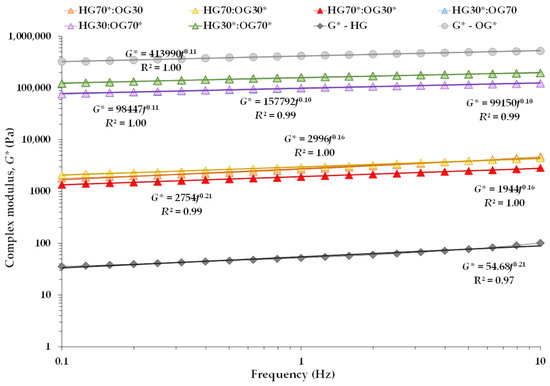 Complex modulus (G*) at 25 °C for bigels prepared at 70:30 and 30:70 ratios, as well as for the individual hydrogel (HG*) and oleogel (OG*) phases, as a function of the applied frequency at a selected stress within the LVR, along with potential fits to the weak gel model.