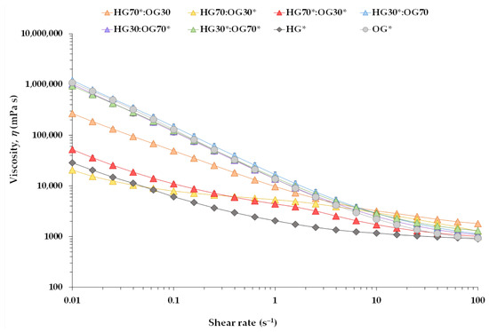 Viscosity (η) at 25 °C for bigels prepared at 70:30 and 30:70 ratios, as well as for the individual hydrogel (HG*) and oleogel (OG*) phases, as a function of the applied shear rate.