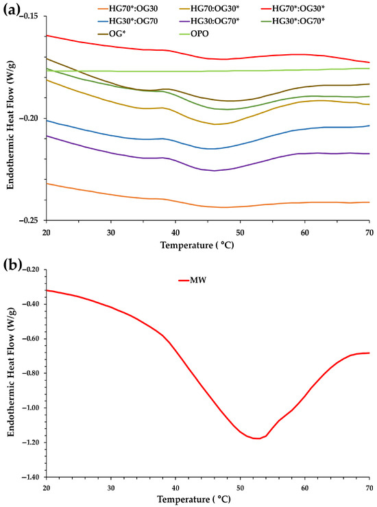 Melting profiles obtained by DSC: (a) For bigels (BGs) formulated at 70:30 and 30:70 ratios, individual oleogel (OG*) phase, and olive pomace oil (OPO); (b) For microcrystalline wax (MW).