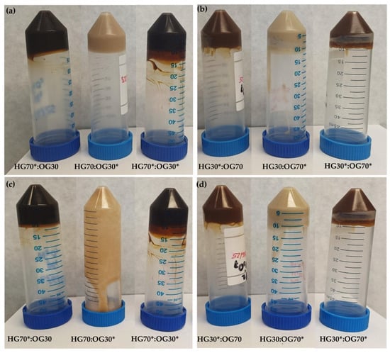 The total loss (%) of each BG, which primarily consisted of OPO loss rather than water loss, is also included in Table 7. This result suggest that the instability mechanism is mainly associated with the release of the oil phase, rather than water migration. As expected, these losses were slightly higher in BGs formulated at the 30:70 ratio compared to those at the 70:30 ratio, which can be attributed to the higher OPO content in the OG phases of the 30:70 formulations (Table 2). In turn, at each ratio, the total loss was lower when the I-CFE extract was not present in the HG and was replaced by water (Table 7). The highest total loss was observed in BG HG30*:OG70* (8.25%), which contained 59.60% OPO and 29.40% I-CFE. These results suggest that, even in this latter case, the high proportions of oil and water present in the BG were effectively retained, with all samples exhibiting full stability under high centrifugal forces and over time (Figure 6c,d) with the mentioned exception. Total loss values recorded in this study (ranging from 0.00% to 8.25%) fall within the typical range reported for bigels formulated using a carrageenan/locust bean gum-based HG and a glyceryl monostearate-based OG [32], as well as those produced using gelatin and waxes, where solvent loss remained below 10% [9].