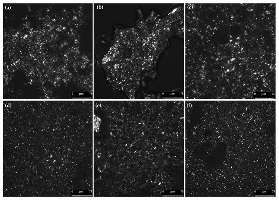 The microstructural characteristics of the BGs were analyzed using polarized light microscopy (PLM) to evaluate the formation of the crystalline network influenced by HG:OG ratio and the presence or absence of CFEs (I-CFE and/or P-CFE) (Figure 7). According to the PLM images, the OG phase acted as the dispersed phase, while the HG served as the continuous phase in the 70:30 ratio (Figure 7a–c), and vice versa in OG-rich BGs (30% HG) (Figure 7d–f). Therefore, phase inversion occurred between these formulations at different HG:OG ratio. Similar observations have been reported for lycopene-loaded [6] and lutein-loaded bigels [7]. PLM images indicate that BGs exhibit both amorphous and crystalline characteristics derived from the individual HG and OG phases, respectively. Crystals in the OG phase appeared bright due to birefringence, whereas the HG phase appeared dark under PLM. All BGs showed needle-like crystalline structures, similar to those observed in other natural waxes used in the development of both OGs and BGs [27,33,34].
