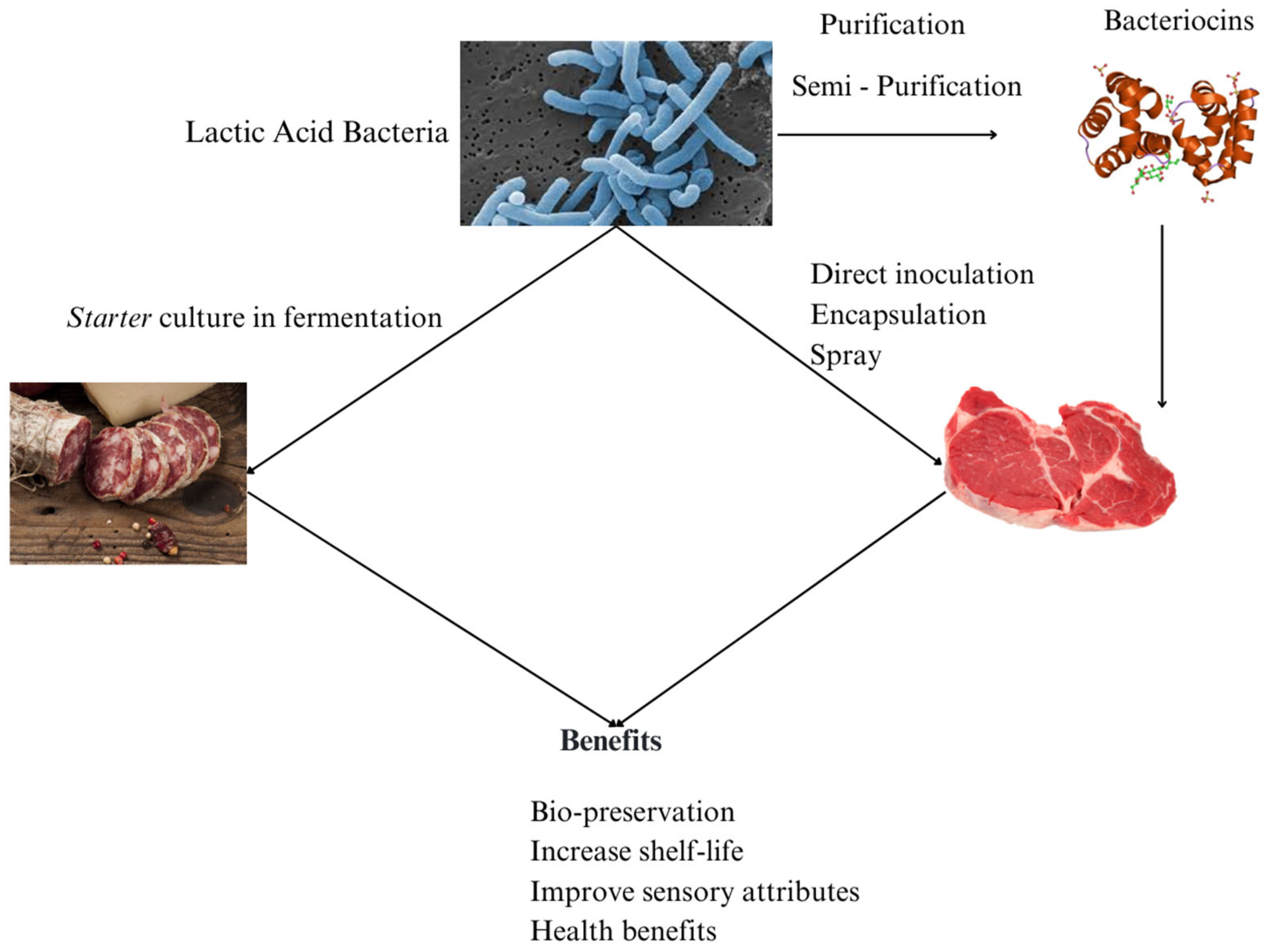 3.3. Bacteriocins in Fermented Sausage Meat