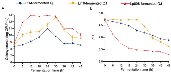 During fermentation, bacterial enumeration and pH dynamics serve as critical monitoring parameters, reflecting the biological state of the fermentation system and metabolic environment, respectively [21]. Bacterial counts directly indicate bacterial proliferation and are essential for evaluating fermentation progress and probiotic effect of LAB [22]. Three LAB strains exhibited distinct growth patterns during the 48 h fermentation (Figure 1A). All strains demonstrated sustained viability throughout fermentation, maintaining final viable bacterial counts exceeding 8.50 ± 0.10 log CFU/mL. Lp808 exhibited the fastest growth rate in QJ, achieving a maximum viable count of 12.94 ± 0.03 log CFU/mL at 12 h. In contrast, Lr18 displayed delayed growth initiation, requiring 30 h to reach its peak concentration of 12.63 ± 0.06 log CFU/mL. Lf14 maintained consistently lower growth rates throughout the process that was inferior to other strains. These results indicated that the nutrients in QJ could meet the basic growth requirements of all three LAB strains particularly Lp808. This aligns with previous reports highlighting the adaptability of LAB to plant substrates, particularly Lactiplantibacillus plantarum, which is recognized for its superior metabolic versatility in utilizing plant-derived nutrients [23,24,25].