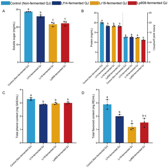 Changes in the soluble sugar (A), total protein and amino acid (B), total phenol content (C) and total flavonoid content (D) of control (non-fermented QJ) and all three LAB-fermented QJ. Letters were used to indicate statistical significance between samples (p < 0.05) based on one-way ANOVA.