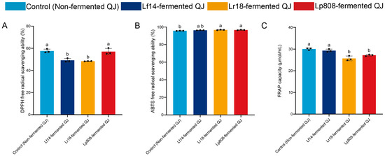 Changes in the DPPH radical scavenging activity (A), ABTS radical scavenging activity (B) and ferric reducing antioxidant power (FRAP) (C) of control (non-fermented QJ) and all three LAB-fermented QJ. Letters were used to indicate statistical significance between samples (p < 0.05) based on one-way ANOVA.