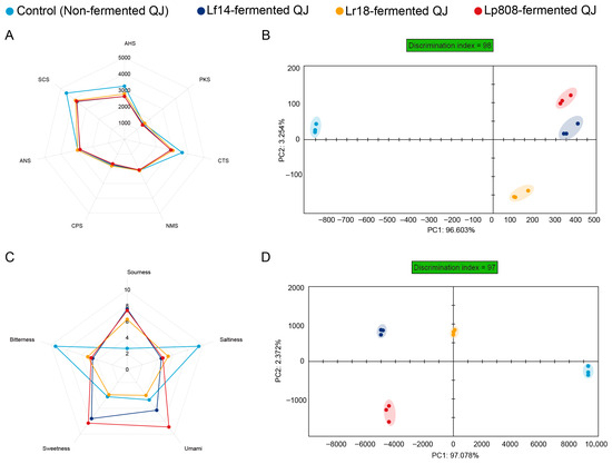 E-tongue sensor response value radar chart (A), E-tongue principal component analysis (B), taste radar chart (C) and E-nose principal component analysis (D) of control (non-fermented QJ) and all three LAB-fermented QJ.