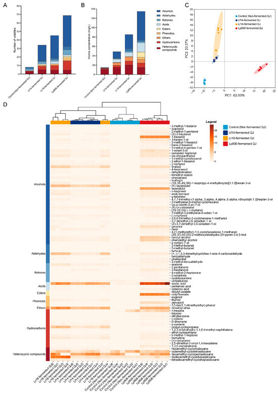 PCA of all detected volatiles highlighted distinct clustering patterns among control (non-fermented QJ) and fermented groups (Figure 5C). The cumulative contribution rate of PC1 and PC2 reached 85.4%, capturing most variance between fermented and control (non-fermented QJ) samples. Clear separation was observed: Non, Lf14, and Lr18-fermented QJ clustered along the negative PC1 axis, while Lp808-fermented QJ occupied the positive PC1 axis. Additionally, control (non-fermented QJ) and Lp808-fermented QJ grouped on the negative PC2 axis, whereas Lf14 and Lr18-fermented QJ aligned with the positive PC2 axis. The PCA indicated pronounced volatile differences between Lp808-fermented QJ and the other two LAB-fermented groups, alongside similarities between Lf14 and Lr18-fermented QJ.