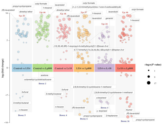 Volcano plots showing differential volatile compounds in control (non-fermented QJ) and QJ fermented by different LAB Strains. Abbreviation: Control, Control (Non-fermented QJ); Lf14, Lf14-fermented QJ; Lr18, Lr18, Lr18-fermented QJ; Lp808, Lp808-fermented QJ.