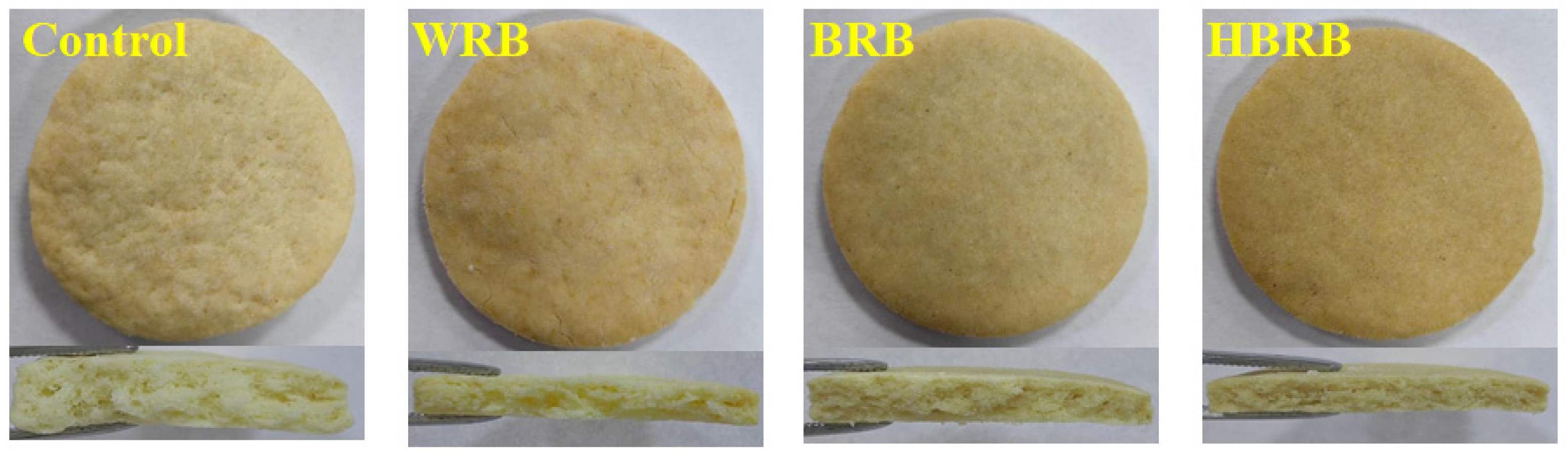 Biscuits were prepared using the method described by Islam et al. with slight modifications [23]. With 100 g of wheat flour as the benchmark, 30 g of butter, 15 g of sugar, 15 g of whole milk powder, 0.4 g of salt, 2 g of baking powder, and 35 g of whole milk were added, respectively, to form a dough. The dough was pressed into a 4 mm thick layer in a round mold (5 cm diameter) and baked in a baking oven for 15 min at 160–165 °C. All biscuit formulations shared identical ingredients, with the only variation being the primary raw material (i.e., the flour type). The biscuits prepared from 100% wheat flour, 100% white rice flour (ultrafine grinding), 100% brown rice flour (ultrafine grinding) and 100% heat moisture treated brown rice flour (ultrafine grinding) were labeled control, WRB, BRB and HBRB, respectively.