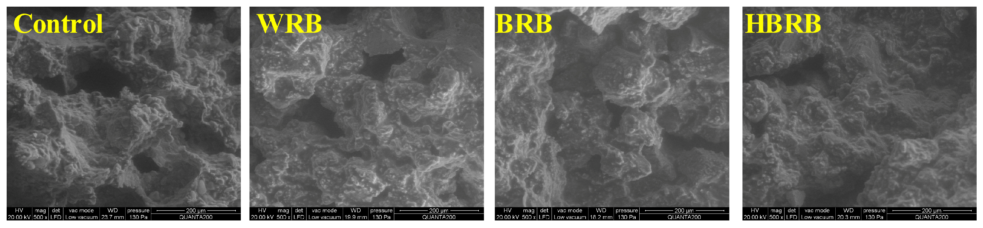 The surface, cross-sectional image, and microstructure of the biscuits are shown in Figure 1 and Figure 2. As seen in Figure 1, the control sample exhibited an uneven surface with irregular pores, followed by WRB, which showed a relatively smooth surface but a greater number of cracks. In contrast, both BRB and HBRB displayed better appearance, in particular, HBRB presented a smooth and delicate surface, albeit with the darkest color, which is consistent with the chromaticity value. SEM results (Figure 2) revealed that the starch gelatinized to form a gel state during the baking process, so the clustered starch particles and tightly wrapped structure of the protein matrix are shown in the cross-section [30]. Wheat flour contains a large amount of gluten that forms a three-dimensional structure during baking, resulting in more pores and lower hardness. In contrast, the HMT modified the structure of components such as dietary fiber, starch, and protein in brown rice, ultimately contributing to a better organized biscuit structure.