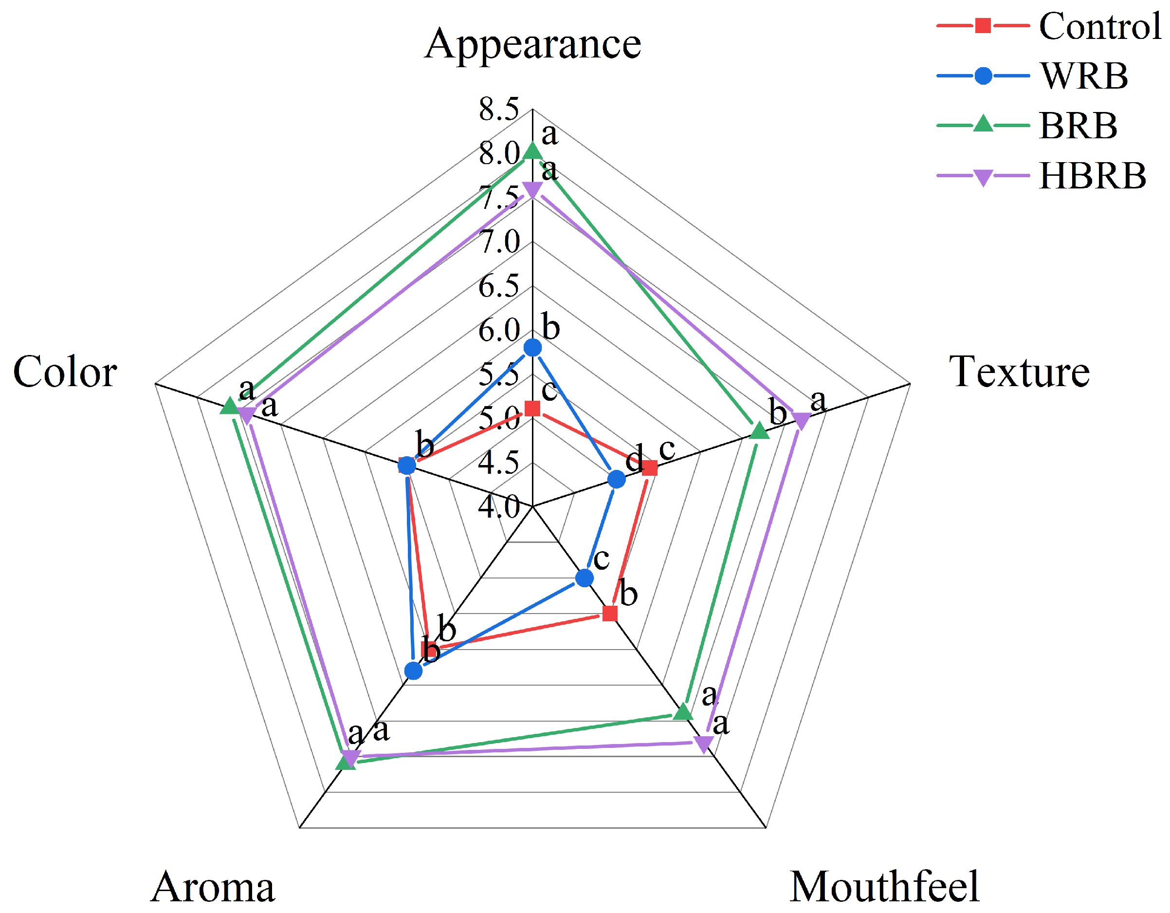Figure 3. Sensory evaluation results of the biscuits. Values in the same row followed by different superscript letters are significant at p < 0.05.