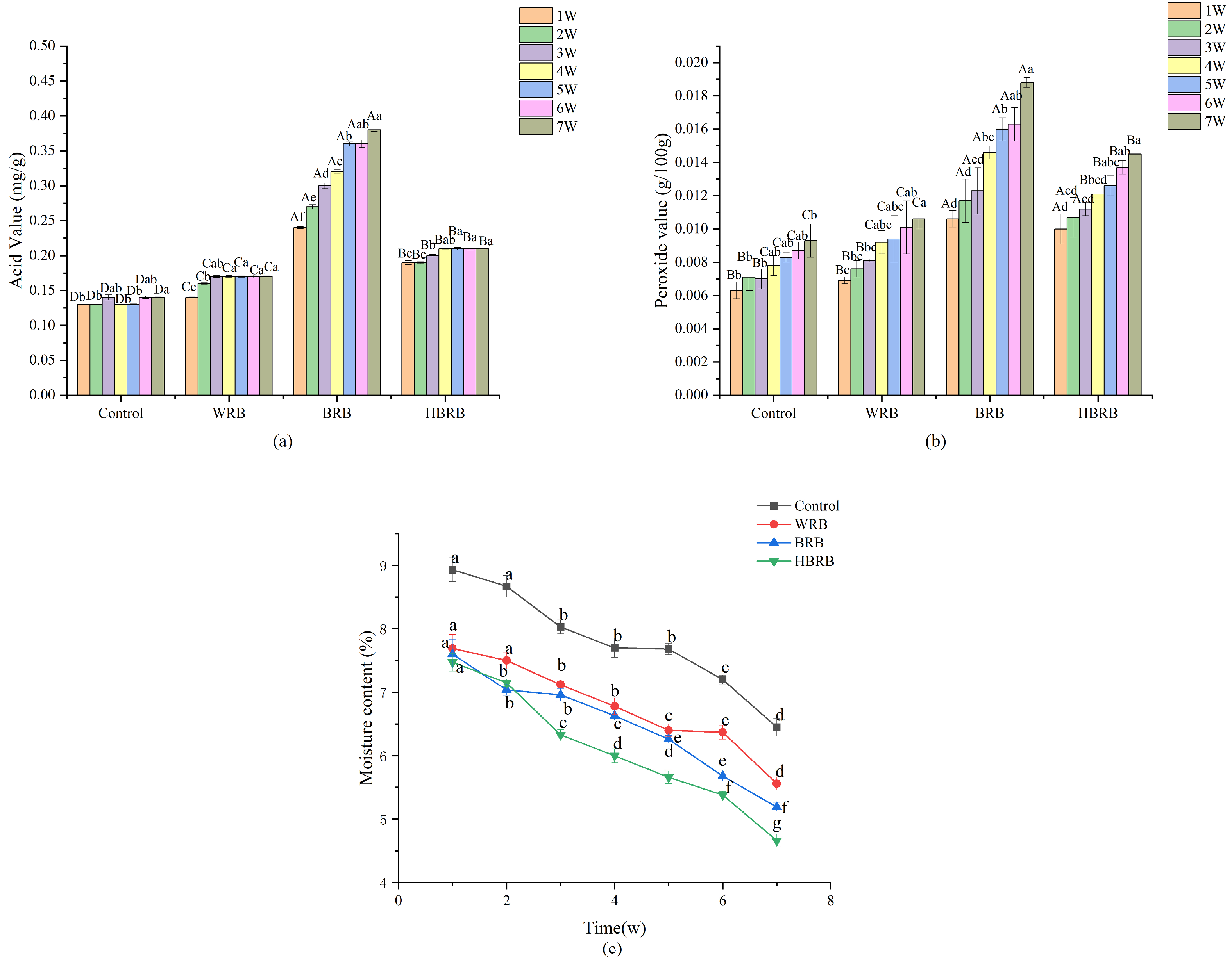 Figure 4. Storage properties of the biscuits: (a) acid value, (b) peroxide value, and (c) moisture content. Lowercase letters (a, b, c, etc.) indicate significant differences (p < 0.05) in acid value and peroxide value of the same biscuit sample under different storage periods; Uppercase letters (A, B, C, etc.) indicate significant differences (p < 0.05) in acid value and peroxide value among different biscuit samples under the same storage period.