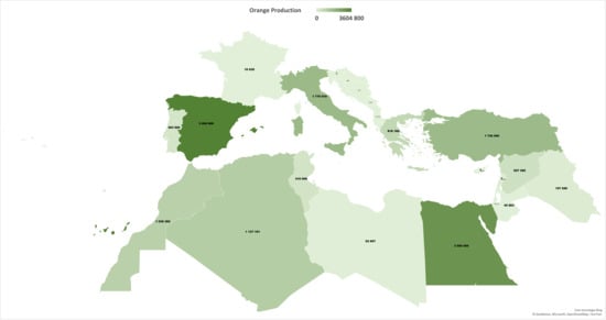 Sweet orange (Citrus sinensis L. Osbeck) is one of the most cultivated and consumed citrus fruits globally. It is valued for its taste, nutritional benefits, and health-promoting properties [1,2]. In 2023, global orange production reached 46 million tons [3], accounting for 60% of citrus output. Mediterranean countries are among the most important producing regions (≈12 million tons in 2022). Figure 1 illustrates the distribution of orange production across Mediterranean countries, highlighting the high production in Spain, Egypt, and Turkey. The hot summers and mild winters with marked temperature fluctuations foster superior color and flavor, underpinning the region’s reputation for high-quality oranges [4]. Within the Mediterranean, the European Union (EU) accounts for 47% of output (5.7 million tons in 2022/2023) [5]. Portugal is the fifth largest producer in the EU, with total production reaching 0.38 million tons in 2022. About 74% of Portugal’s citrus area and 90% of the output are in the Algarve. Oranges, clementines/mandarins, and lemons from this region are protected under the EU PGI “Citrinos do Algarve”, which has a significant economic impact both nationally and internationally.