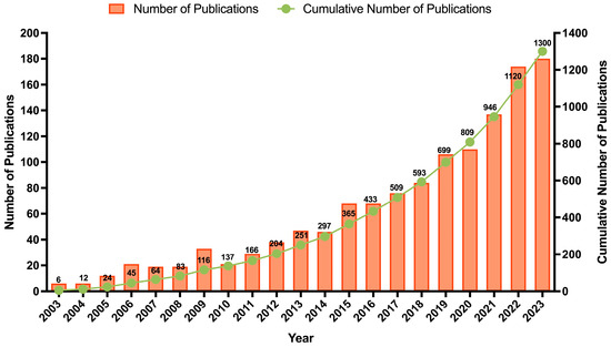 From 2003 until 2023, a total of 1300 documents were published on this topic (1264 articles, 21 book chapters, and 15 reviews). The evolution of the research activity over this period is presented in Figure 3. An interesting conclusion is that over the last decade, the number of published documents (80.69%; n = 1049) was significantly higher than that of the previous decade (19.31%; n = 251), demonstrating the increased interest and investment in the upcycling and valorization theme. The authors observed that half of the documents focused on three subject areas: agricultural and biological sciences (14.7%), chemistry (13.8%), and environmental science (11.6%). Many studies have explored the extraction of BCs, such as pectin and antioxidant extracts, while recent documents have assessed their bioactive effects and applications. Within the agricultural and biological sciences area, 47% of publications are categorized under food sciences. Notably, over 85% of these publications were produced in the last decade, with prominent contributions from journals such as Food Chemistry (n = 16), Journal of Food Processing and Preservation (n = 14), and LWT—food science and technology (n = 13). This shift might be attributed to the growing global focus on sustainability and circular economy practices, advancements in extraction technologies, increased consumer demand for natural and functional products, and stricter policies promoting food waste valorization.