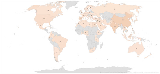 In addition to the number and topics of publications, it is interesting to examine the geographic distribution of the topics (Figure 4). The number of publications by geographic location revealed that China had the most publications on the subject (15.6%), followed by India (15.1%) and Spain (7.9%). However, grouping the Mediterranean countries reaches a higher publication percentage (28.7%) than China, India, and Brazil. These countries produce large quantities of citrus fruits, particularly oranges, resulting in significant by-product volumes. Consequently, there is a burgeoning research trend in these nations focused on finding new and innovative methods to valorize this waste, which subsequently drives up the publication rate.