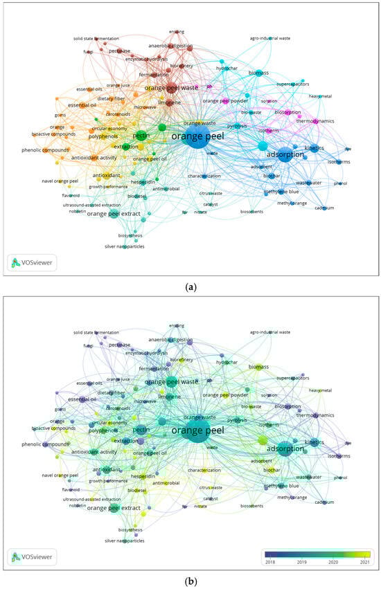 The total number of research articles from the last ten years was analyzed in Vosviewer® to ascertain the co-occurrence of author keywords. The bibliometric map (Figure 5a) illustrates a network of keywords, highlighting thematic relationships among research topics. Node size is proportional to the number of publications associated with each keyword. The nodes are grouped into clusters, each represented by a color. Additionally, the distance between keywords reflects the strength of their association, with shorter distances indicating stronger associations within the research topics. A total of 2583 keyword co-occurrences were identified across the publications, with at least five keywords appearing together in the title, abstract, or keyword list. As a result, 124 keywords were grouped into eight distinct clusters. The network of keywords is centered on OP, which appeared in 204 studies, followed by other representative keywords such as adsorption, kinetics, activated carbon, and extraction. The keywords in dark and light blue, pink, and brown clusters are related to environmental studies. Interestingly, the brown cluster is correlated with the biorefinery concept, which connects with the green, orange, and yellow clusters. These clusters focus on key BCs extracted from OP, such as hesperidin, pectin, polyphenol-rich extracts, and EOs, highlighting their diverse applications in upcycled ingredients for food and nutraceuticals. In order to further understand how these research topics have evolved over time, a second analysis was generated. Figure 5b presents the temporal evolution of keywords, where the yellow nodes correspond to the recent research keywords that emerged mainly from 2021 onwards. This analysis reveals a clear shift in OP research over the last decade. Earlier studies (blue nodes) focused mainly on wastewater treatment, heavy metal removal, and adsorption, reflecting the traditional environmental engineering perspective on OP as a low-cost adsorbent. In contrast, the most recent keywords (green to yellow color gradient) such as biorefinery, circular economy, green extraction, polyphenols, and pectin highlight a transition toward high-value upcycled ingredients and sustainable food waste valorization.
