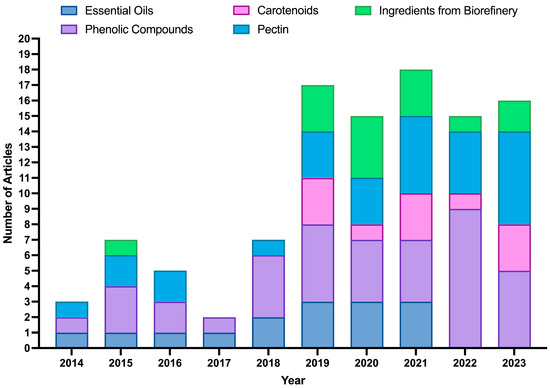 Annual distribution (2014–2023) of scientific articles focused on the extraction of ingredients from orange peels. The publications were categorized according to the main targeted ingredients extracted: essential oils, phenolic compounds, carotenoids, pectin, and ingredients obtained through integrated biorefinery approaches.