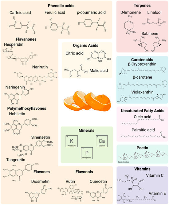 Spectrum of most representative nutrients and phytochemicals present in orange peels.