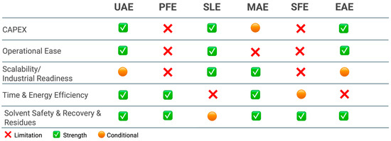 The recovery of BCs using eco-friendly methodologies stands at the forefront of agro-food research. Extraction plays a vital role in obtaining BCs from by-products. Various extraction methods can be employed, but the primary goal is to maximize both yield and quality. This must be achieved while minimizing time, energy consumption, solvent use, environmental impact, economic costs, and waste [14]. Nevertheless, achieving high-purity BCs derived from food by-products for human consumption remains challenging. Recent advancements in green extraction methods, spurred by the Twelve Principles of Green Chemistry [67], emphasize minimizing energy consumption, utilizing sustainable solvents and renewable natural products, and ensuring the safety and high quality of the extracts/ingredients. While numerous reviews have explored both conventional and green extraction approaches for citrus by-products, most address citrus waste broadly and offer limited specificity for OP. Collectively, the literature highlights a growing preference for green extraction methods such as MAE, EAE, UAE, PFE, and SFE, due to their ability to improve extract purity, reduce solvent use, and enhance process efficiency. However, these studies rarely compare methods side-by-side in the context of OP or consider their integration into scalable biorefinery systems. This lack of consolidation hinders the identification of optimal strategies tailored to OP’s matrix and compound diversity. By addressing this gap, the present review aims to critically map and compare current extraction technologies applied specifically to OP valorization under a sustainability and zero-waste lens.
