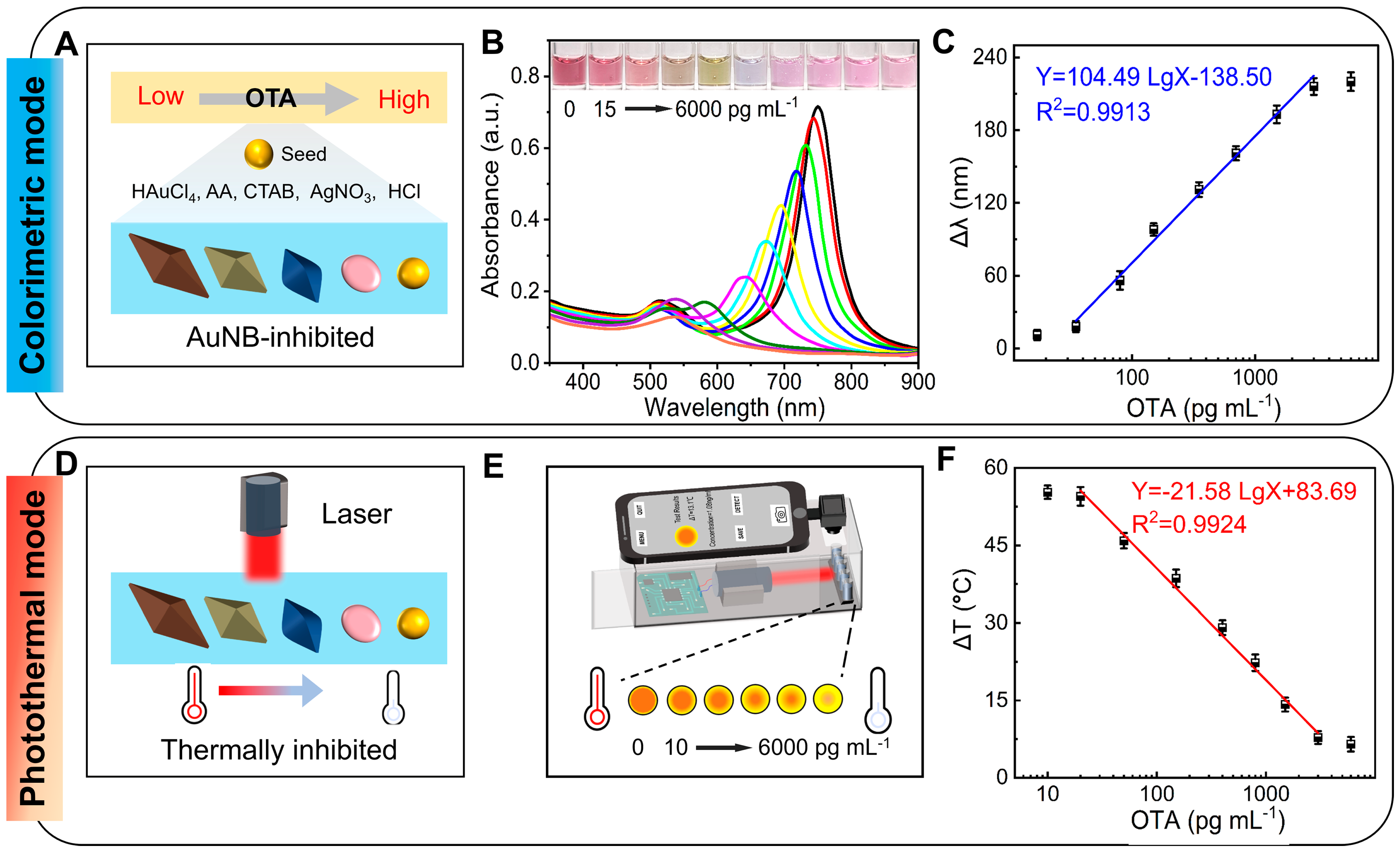 - Dual-mode signal reading: The incubated solution (100 μL) underwent UV-Vis spectrum analysis. The TSPR offset (∆λ) of AuNBs was calculated using the following equation: ∆λ = λ(TSPR of AuNBs without OTA inhibition) − λ(TSPR of AuNBs with OTA inhibition). At the same time, the incubated solution (100 μL) was irradiated at a vertical distance of 2.0 cm for 6 min using a 780 nm near-infrared (NIR) laser. The real-time temperature changes for the solution were monitored using an external infrared camera. The temperature difference (ΔT) was obtained through the following equation: ΔT = T(max, blank control) − T(max, sample).
