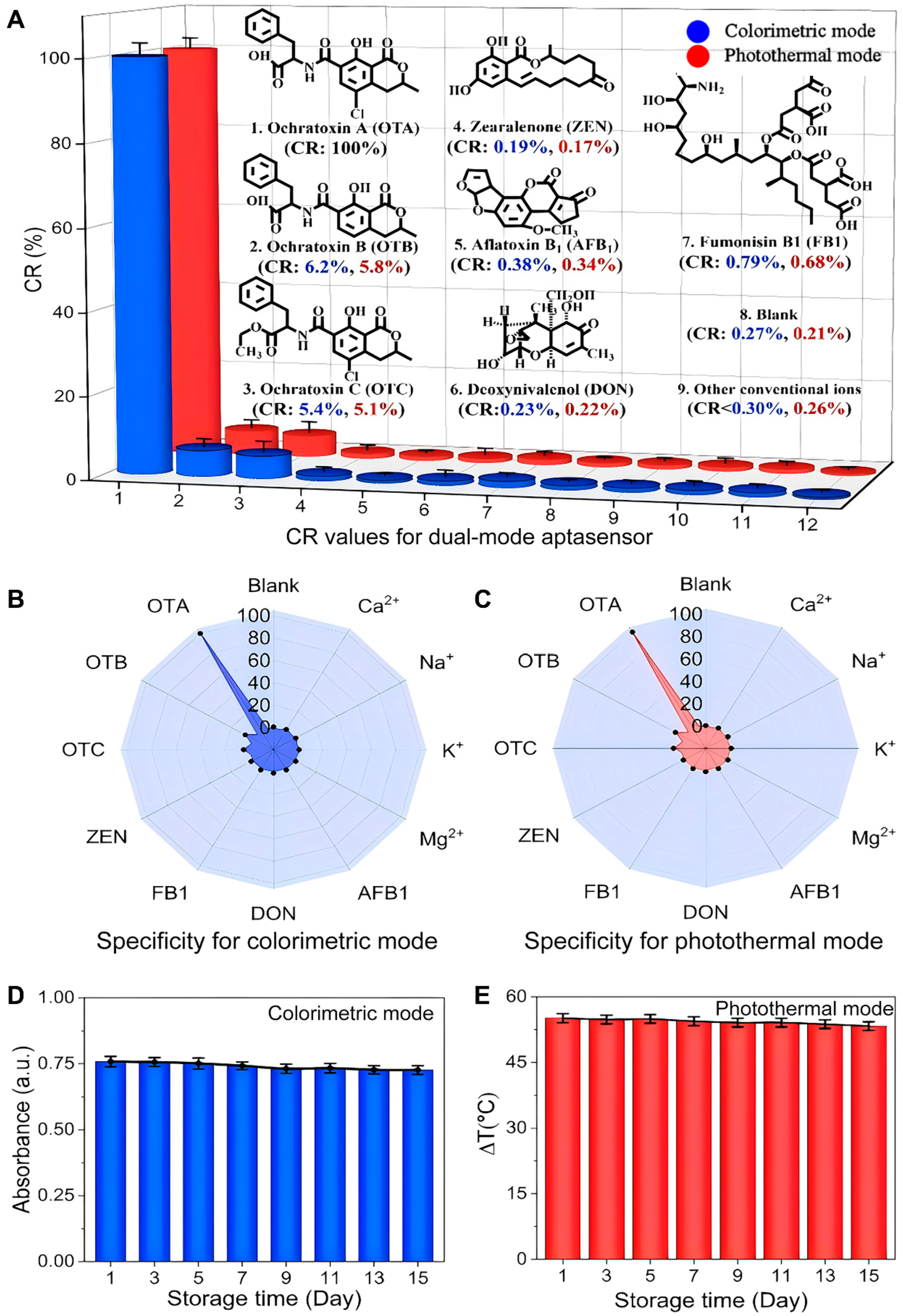 Dual-Mode Plasmonic Colorimetric/Photothermal Aptasensor for OTA: Based on a Mn2+-Powered DNA Walker for Mediating AuNB Growth