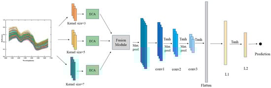 In this study, the deep learning-based MSFNet-ECA model was constructed, with its architecture illustrated in Figure 2. The network consists of three parallel multi-scale convolution branches (branch3, branch5, branch7), three Efficient Channel Attention (ECA) blocks, a Feature Fusion Module, three one-dimensional convolutional layers (conv1, conv2, conv3), a Flatten layer, and two fully connected regression layers (L1 and L2). The multi-scale branch module comprises one-dimensional convolutional layers with receptive fields of 3, 5, and 7 to extract local features at different scales from one-dimensional spectral sequences. After convolution, each branch is connected to an ECA block, as shown in Figure 3a. By leveraging an adaptive local cross-channel interaction mechanism, the ECA block strengthens feature representations across the channel dimension, enabling the network to better capture critical information. Specifically, the ECA module initially performs global average pooling on the convolutional feature maps to produce a channel descriptor vector. Then, a one-dimensional convolution replaces the conventional fully connected layer to achieve localized cross-channel information interaction, which effectively captures inter-channel dependencies while significantly reducing the number of model parameters. Finally, a Sigmoid activation function is applied to produce channel-wise attention weights, which are used to reweight the input features channel by channel, thereby strengthening the selective expression of salient channel features.