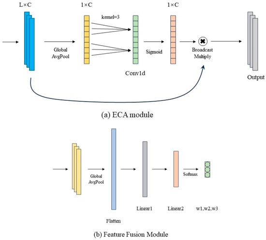 Structural illustration of key components in the MSFNet-ECA model: (a) the ECA module, which employs global average pooling and 1D convolution to capture inter-channel dependencies and generate adaptive attention weights; (b) the Feature Fusion Module, implemented as a multilayer perceptron that applies global pooling and Softmax-based weighting to adaptively integrate multi-scale spectral features.