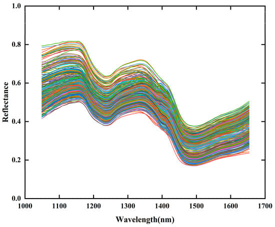 As shown in Figure 4, the raw spectral reflectance curves of all samples exhibit distinct differences in reflectance intensity, likely due to varying AFB1 concentrations among samples. The spectral curves display distinct peaks or troughs near 1153 nm, 1239 nm, 1349 nm, and 1477 nm. Among these, the peaks and troughs at 1153 nm and 1239 nm are associated with C-H groups [47]. The peak at 1349 nm corresponds to the combination stretching vibration of the C-H bond, while the trough at 1477 nm is related to the O-H group vibration and the structural characteristics of starch molecules, which are to some extent associated with the presence of Aspergillus flavus [19]. The observed peaks and troughs at these wavelengths are consistent with previous studies, further validating the reliability of the spectral detection results in this study.