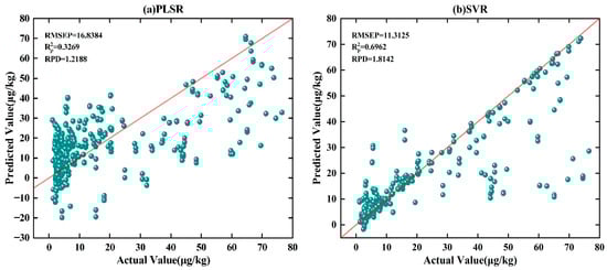 In particular, among all preprocessing methods, the performance of multiplicative random scaling combined with D2 preprocessing achieved the best performance, with RMSEP of 2.3 μg·kg−1 and of 0.99. Compared with results without preprocessing, the model’s RMSEP decreased by 14.7 μg·kg−1, increased by 0.62, and RPD improved from 1.2 to 9, indicating that integrating preprocessing with data augmentation substantially enhanced the model’s predictive capability.
