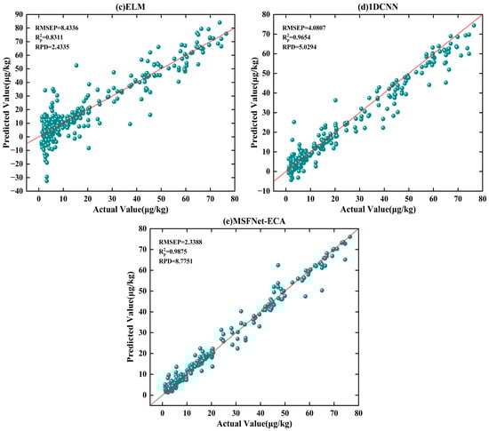 To highlight the advantages of the MSFNet-ECA model in quantitative analysis, we adopted D2 preprocessing combined with multiplicative random scaling data augmentation. A comparative analysis was then conducted against four commonly used models: PLSR, SVR, ELM, and 1DCNN. The prediction results of each model are shown in Table 4, and their regression scatter plots are illustrated in Figure 5.