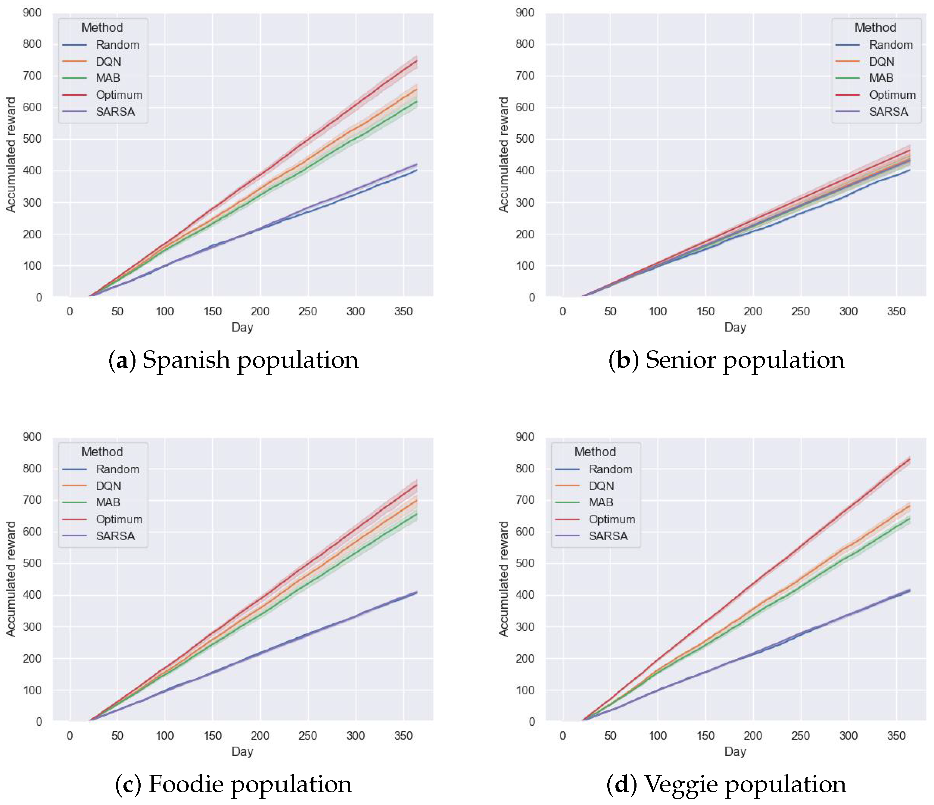 - Accumulated reward refers to the mean of the sum of rewards obtained by each algorithm in the evaluated population. If the recommendation matches the user selection, a reward is provided to the algorithm. This metric indicates how often the algorithm succeeded in recommending the correct item compared with the actual selections.