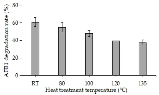 Similarly, Wang et al. [31] reported that the metabolites of Fusarium sp. WCQ3361 exhibited high thermal stability, retaining 99.40% of their AFB1-degrading activity even after boiling for 10 min. Shu et al. [21] found that autoclaving the supernatant of Bacillus velezensis DY3108 at 121 °C for 30 min did not abolish AFB1-degrading activity; instead, an enhancement of degradative capacity was observed.