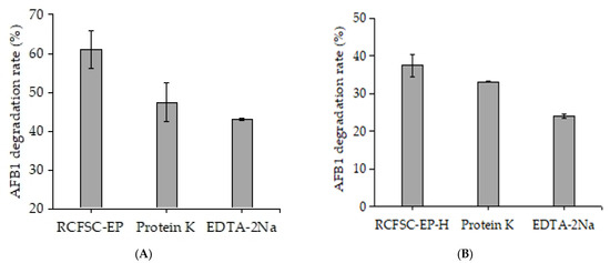 Effects of proteinase K and EDTA-2Na on AFB1-degrading activity of RCFSC-EP or RCFSC-EP-H. (A) RCFSC-EP; (B) RCFSC-EP-H: RCFSC-EP pre-heated at 135 °C for 20 min.