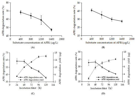 Effects of substrate concentration on AFB1 degradation by RCFSC-EP (A) or RCFSC-EP-H (B). Dynamic substrate replenishment method was employed to evaluate persistence of AFB1 degradation by RCFSC-EP (C) or RCFSC-EP-H (D).