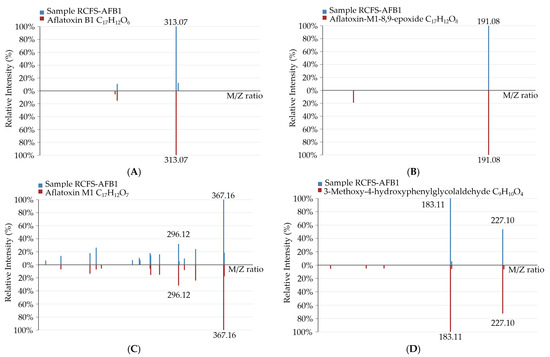 Compared with RCFS-CK, new molecular-ion peaks appeared in the RCFS-AFB1-treated metabolomic chromatograms at m/z 313.0699 ([M + H]+), 327.0511 ([M − H2O + H]+), 367.1544 ([M + K]+), and 227.0533 ([M + HCOO]−), corresponding to molecular formulas C17H12O6, C17H12O8, C17H12O7, and C9H10O4. Matching exact masses, adducts, and MS/MS fragment ions against databases enabled level-2 identification as AFB1, aflatoxin-M1-8,9-epoxide, aflatoxin M1, and 3-methoxy-4-hydroxyphenylglycolaldehyde. The identification spectra are shown in Figure 5.