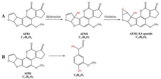 The possible degradation pathways of AFB1 By RCFS. (A) AFB1 is first hydroxylated by RCFS to form AFM1; subsequently, AFM1 is epoxidized to yield AFM1-8,9-epoxide; (B) the bisfuran and coumarin structures of AFB1 may both be destroyed by RCFS, degrading into the product C9H10O4.