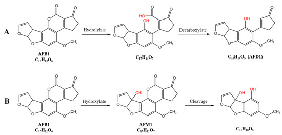 The possible degradation pathways of AFB1 By RCFS. (A) RCFS catalyzes AFB1 to form a β-keto-acid structure, followed by lactone ring hydrolysis and decarboxylation of the opened lactone to yield AFD1. (B) After AFB1 is hydroxylated to AFM1 by RCFS, it may undergo lactone hydrolysis, decarboxylation, and cleavage to form C11H10O5, retaining the bisfuran moiety but losing the characteristic lactone carbonyl and cyclopentenone ring of AFB1.
