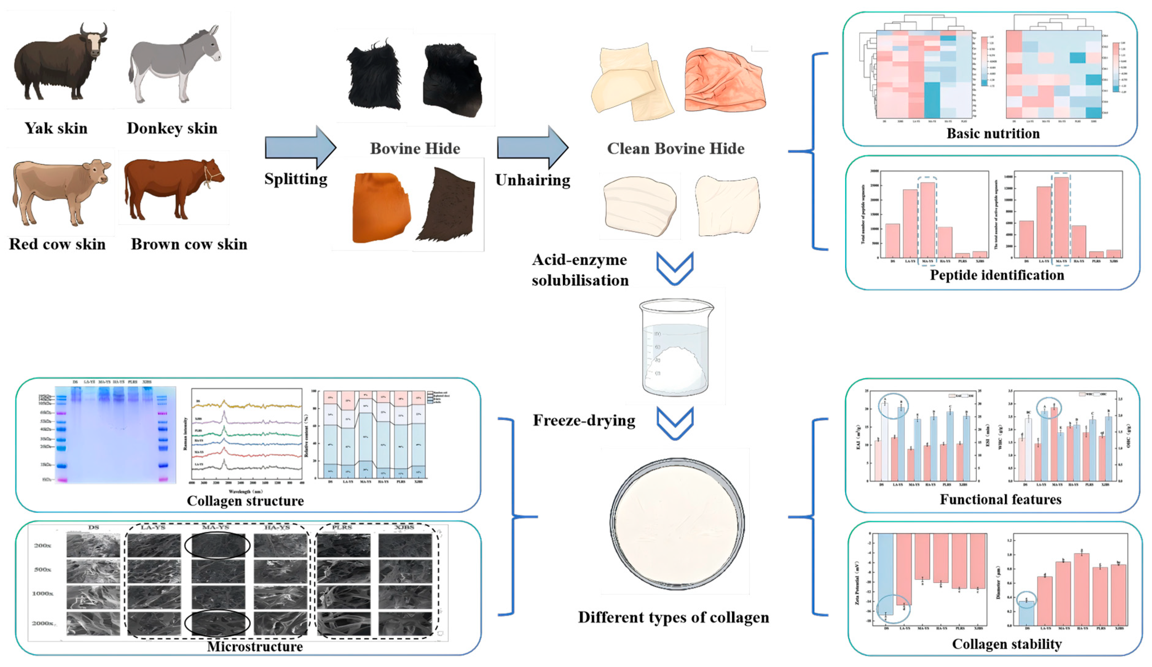 Kuai, Y.; Duan, Y.; Yang, X.; Shen, R.; Wang, W.; Zhang, L.; He, L.; Chen, C.; Yuan, X.; Yan, X.; et al. Skins Comparative Analysis of Collagen Functionality and Peptide Bioactivities from Yak, Cattle, and Donkey Skins. Foods 2025, 14, 3776. https://doi.org/10.3390/foods14213776