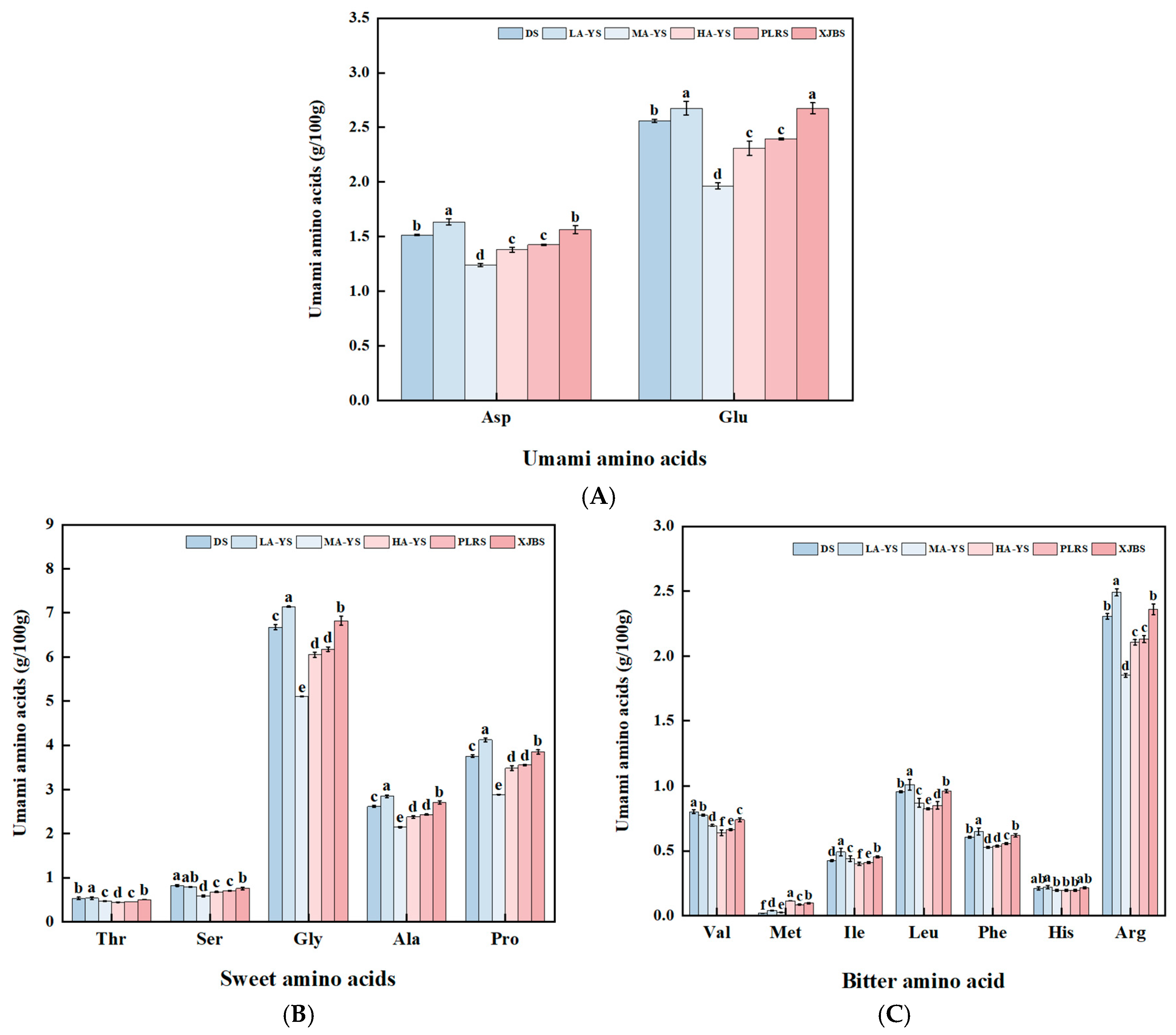 | Variety | Umami Amino Acids | Sweet Amino Acids | Bitter Amino Acid | |||