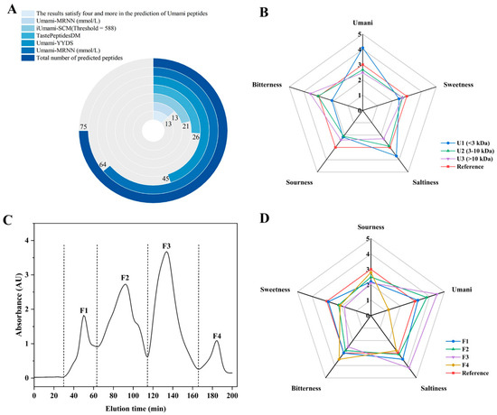 Identification and evaluation of potential umami peptides derived from protein hydrolysates. (A) Prediction results of 75 potential umami peptides by iUmami-SCM, Umami-MRNN, UMPred-FRL, Umami-YYDS, and TastePeptidesDM; (B) Sensory evaluation of various ultrafiltration fractions; (C) Gel filtration chromatogram of ultrafiltration fractions (<3 kDa); (D) Sensory evaluation of subfractions.