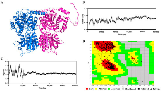 Results of the construction and optimization of the T1R1/T1R3 protein receptor. (A) Initial structure of T1R1/T1R3 receptor protein; (B) Rg values (nm) of the T1R1/T1R3 receptor protein by 100 ns MD simulation; (C) RMSD values (nm) of the T1R1/T1R3 receptor protein by 100 ns MD simulation; (D) Ramachandran plot of T1R1/T1R3 receptor protein after optimization.