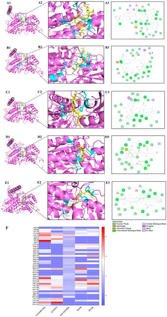 Results of molecular docking poses and the combined state of umami peptides. (A1–A3) GK-9, (B1–B3) GG-9, (C1–C3) GG-6, (D1–D3) MR-4, (E1–E3) SK-5 with the T1R1/T1R3 receptor protein. (F) Heat map results of hydrogen bonds between five potential umami peptides and amino acid residues of the T1R1/T1R3 receptor protein. The numbers 1–2, respectively, represent the binding site and intermolecular interaction force of 2D images of umami peptides and T1R1/T1R3 receptor protein.