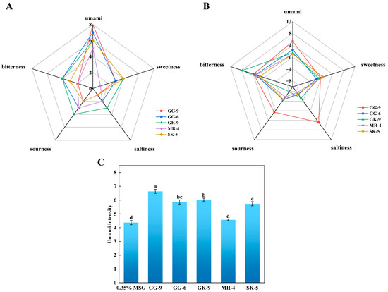 Taste characteristics of synthetic peptides by electronic tongue and sensory evaluation. (A) Taste profiles of sensory evaluation (1 mg/mL); (B) Taste profiles of electronic tongue (0.1 mg/mL); (C) umami-enhancing characteristics of the synthetic peptides. Different lowercase letters indicate significant differences (p < 0.05).