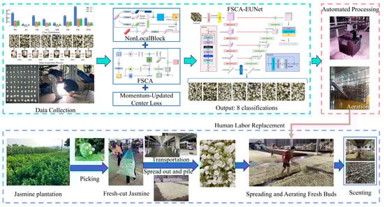 Figure 1 illustrates the overall workflow of this study. After harvesting, transportation, postharvest spreading and aerating, jasmine flowers undergo the scenting process with tea leaves. During the aeration stage, images are collected for model training. These data are then processed by the proposed FSCA-EUNet framework, which integrates FSCA, NonLocalBlock, and momentum-updated center loss for fine-grained bloom stage classification. The classification results are finally applied to automated processing, replacing labor-intensive manual operations in tea scenting.