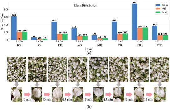 Figure 2. Class distribution and visual examples of jasmine bloom stages. (a) Class distribution of training, validation, and test datasets across eight bloom stages; (b) Sequential visual representation of jasmine flower opening over time intervals.