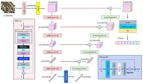 MBConv employs an “expand-compress” inverted residual design. The channel dimensions are first expanded via a 1 × 1 convolution, followed by spatial feature extraction via a depthwise separable convolution, and finally compressed via a projection layer with a residual connection. The integrated EfficientSqueezeExcite module implements lightweight channel attention through global pooling and two-layer cascaded convolutions for dynamic feature recalibration, achieving 30% fewer parameters than standard SE modules while enhancing nonlinear representation via GELU activation.