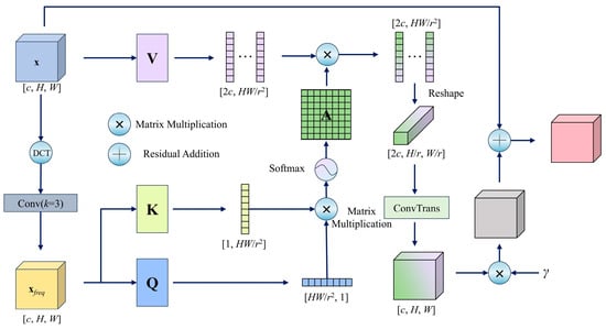 The module first applies a two-dimensional (2D) discrete cosine transform (DCT) to the input feature map x, mapping the spatial features to the frequency domain. A 3 × 3 convolutional layer subsequently extracts high-frequency components xfreq, which enhances the representation of edge and texture details. To reduce computational complexity, a cross-scale interaction strategy is adopted: the query (Q) and key (K) are downsampled to (H/r, W/r) resolution via 1 × 1 convolutions with stride r, reshaped into matrices Q and K, and used to compute the cross-position similarity scores. The scores are normalized by Softmax to generate the attention weight matrix A. The original input x is processed through an independent downsampled channel-expansion layer to produce the value vector V. After aggregating V with A, the output is upsampled via transposed convolution to restore the original resolution, residual-connected to the input features, and dynamically scaled by a learnable parameter γ to modulate the attention intensity. The final output is expressed in Equation (1),